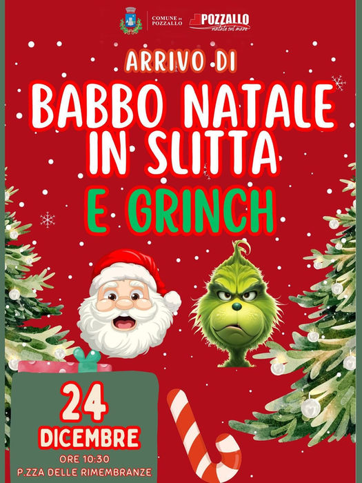 Arrivo di Babbo Natale in slitta e Grinch